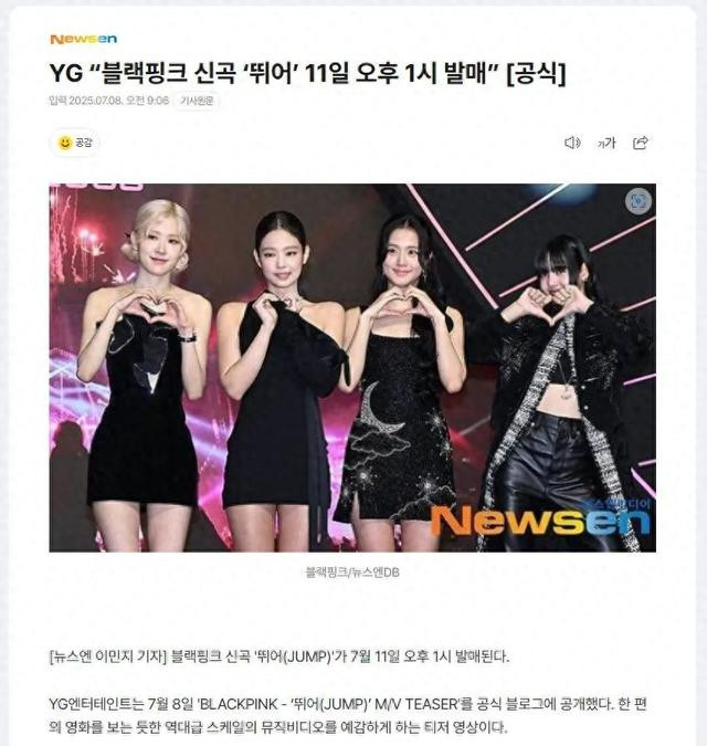 BLACKPINK《JUMP》音源及MV将于北京时间11日12点全球同步上线。该曲目在本月5-6日世界巡演首站高阳演唱会抢先公开舞台后已引发热议,预计将再次掀起全球热潮。